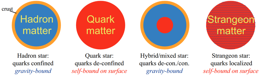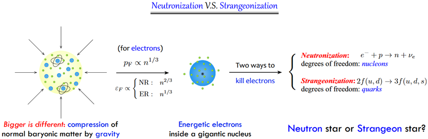 What’s the state of gravity-compressed matter produced during supernova? Unfortunately/fortunately, this remains unknown, to be relevant to the nature of non-perturbative QCD (quantum chromo-dynamics). Historically, in 1930s, Lev Landau speculated that dense matter at supra-nuclear density in stellar cores could be considered as gigantic nuclei (the prototype of standard model of neutron star). A gigantic nucleus should be neutron-rich (renamed neutron star thus) via neutronization. However, Renxin Xu and his collaborators proposed a very different view: the rump left behind after a supernova could be a strangeon star. Nucleon is the constituent of a nucleus, while strangeon is named as the constituent of a gigantic nucleus if three flavor symmetry (u, d and s) restores there. They are both developing the strangeon star model and expecting to test it by further observations.