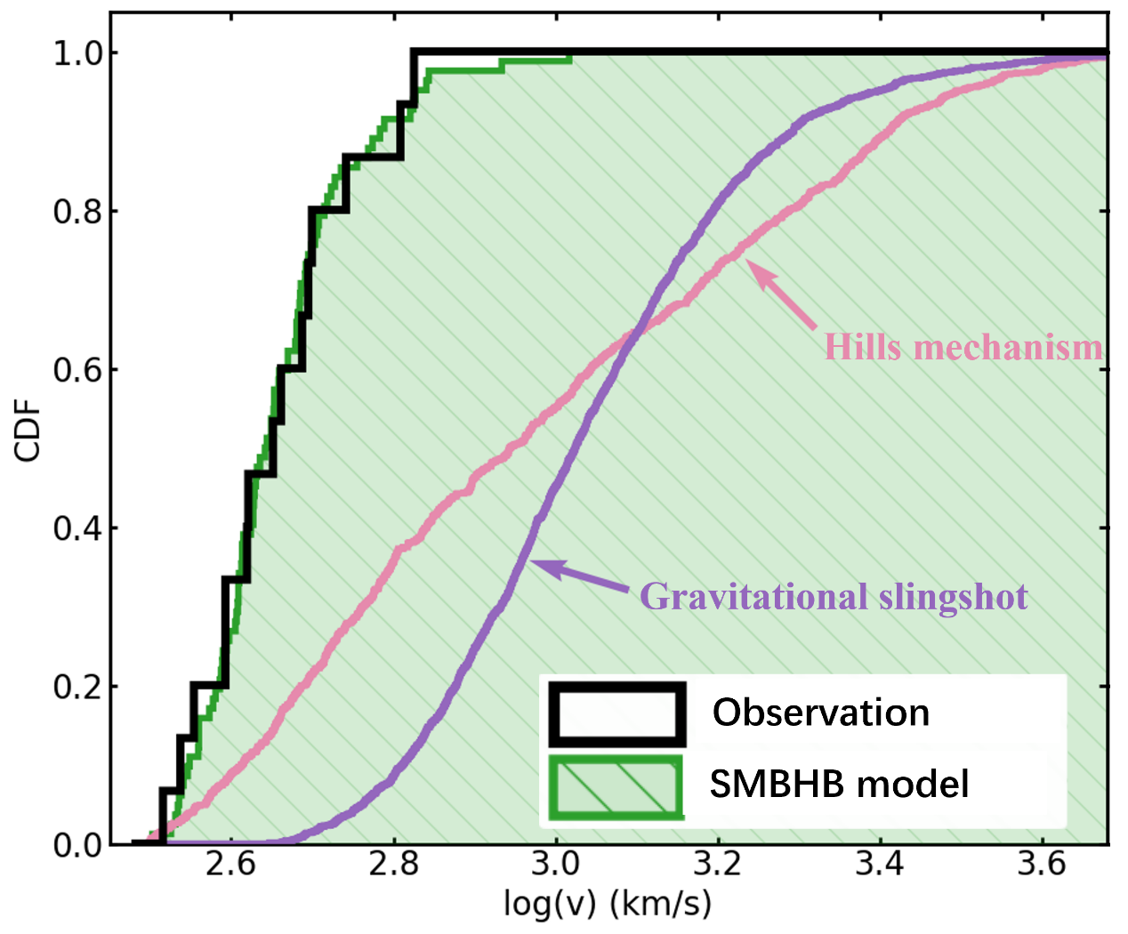 Figure 2: The cumulative velocity distribution histogram of hypervelocity stars. The black histogram shows the observational data from the MMT project, and the green histogram shows the result from the supermassive black hole binary model of this study, both exhibiting an upper velocity limit at 700 km/s. In contrast, the velocity distributions predicted by the other two models (purple line for the Hills mechanism; pink line for the gravitational slingshot effect) clearly deviate from the observations.