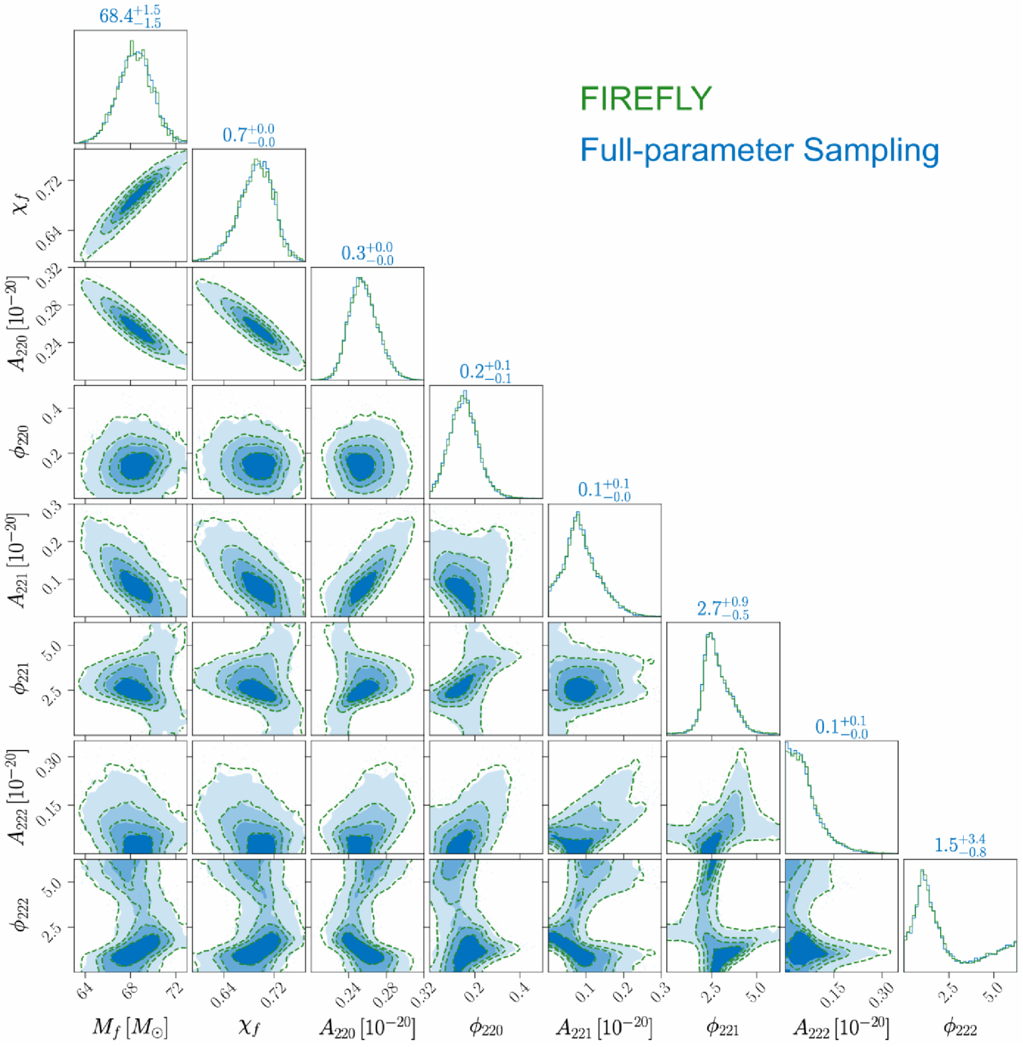 Figure 2: Comparison of posterior samples obtained with FIREFLY (green) and the traditional Bayesian method (blue). It can be seen that FIREFLY produces extremely high-fidelity results for all inferred parameters, including mass Mf, spin cf and other amplitude and phase parameters (Y. Dong, Z. Wang, et al. 2026)