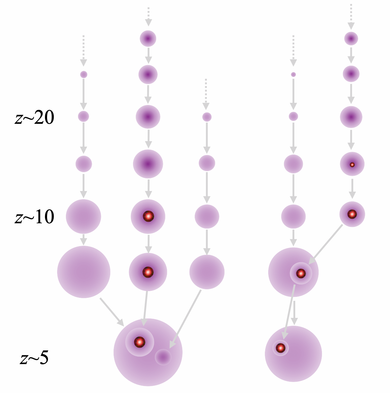 Figure: In a self-interacting dark-matter universe, a halo that formed early and was exceptionally dense at the center can undergo core collapse before reionization, giving rise to a supermassive black hole seeded directly from dark matter.