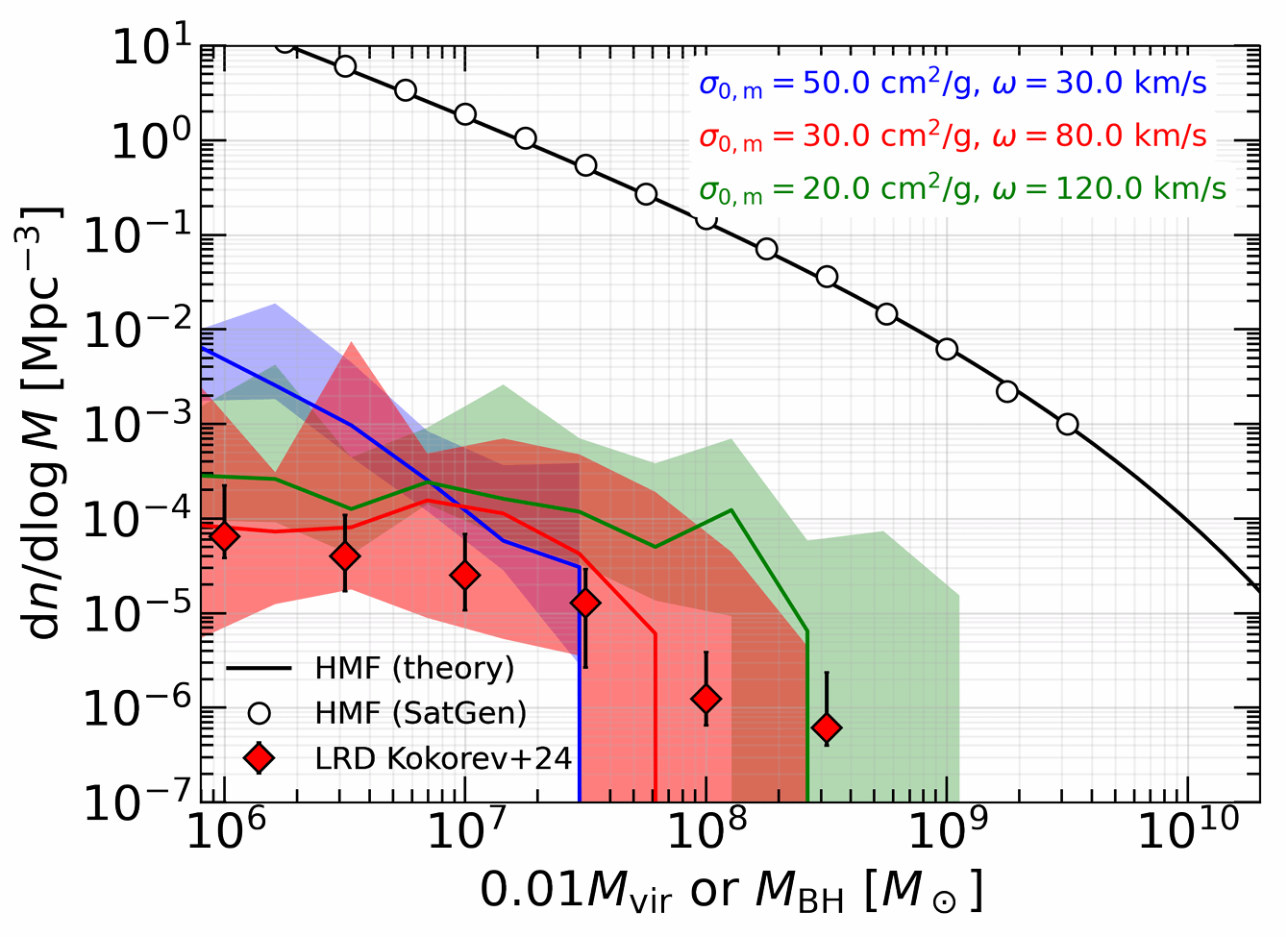 Figure: Black-hole mass functions of the Little Red Dots at redshift of 5 predicted by the model of the core-collapse of self-interacting-dark-matter (SIDM) halos and black-hole growth. The fiducial case (red) adopts a velocity-dependent SIDM cross section with σ0m = 30cm−1g and ω = 80kms−1 -- values consistent with independent constraint from nearby galaxy kinematics. Observationally inferred BHMFs for LRDs at z = 4.5–6.5 are shown as diamonds with error bars or arrows indicating upper limits. Two alternative cross-section models (blue and green) illustrate the sensitivity of the predicted BHMF to SIDM parameters: increasing the low-velocity cross section σ0m boosts the low-mass end, while increasing ω enhances the massive end.