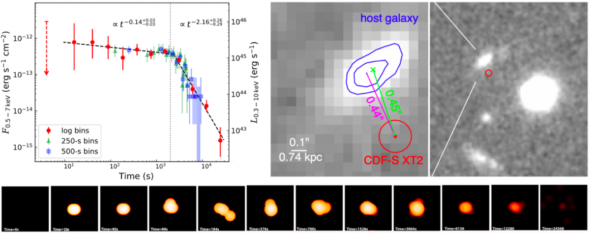 Figure 2. Upper Left: X-ray lightcurve of XT2. Upper Right: HST image of the XT2 Host galaxy. Lower panels: Chandra images of XT2
