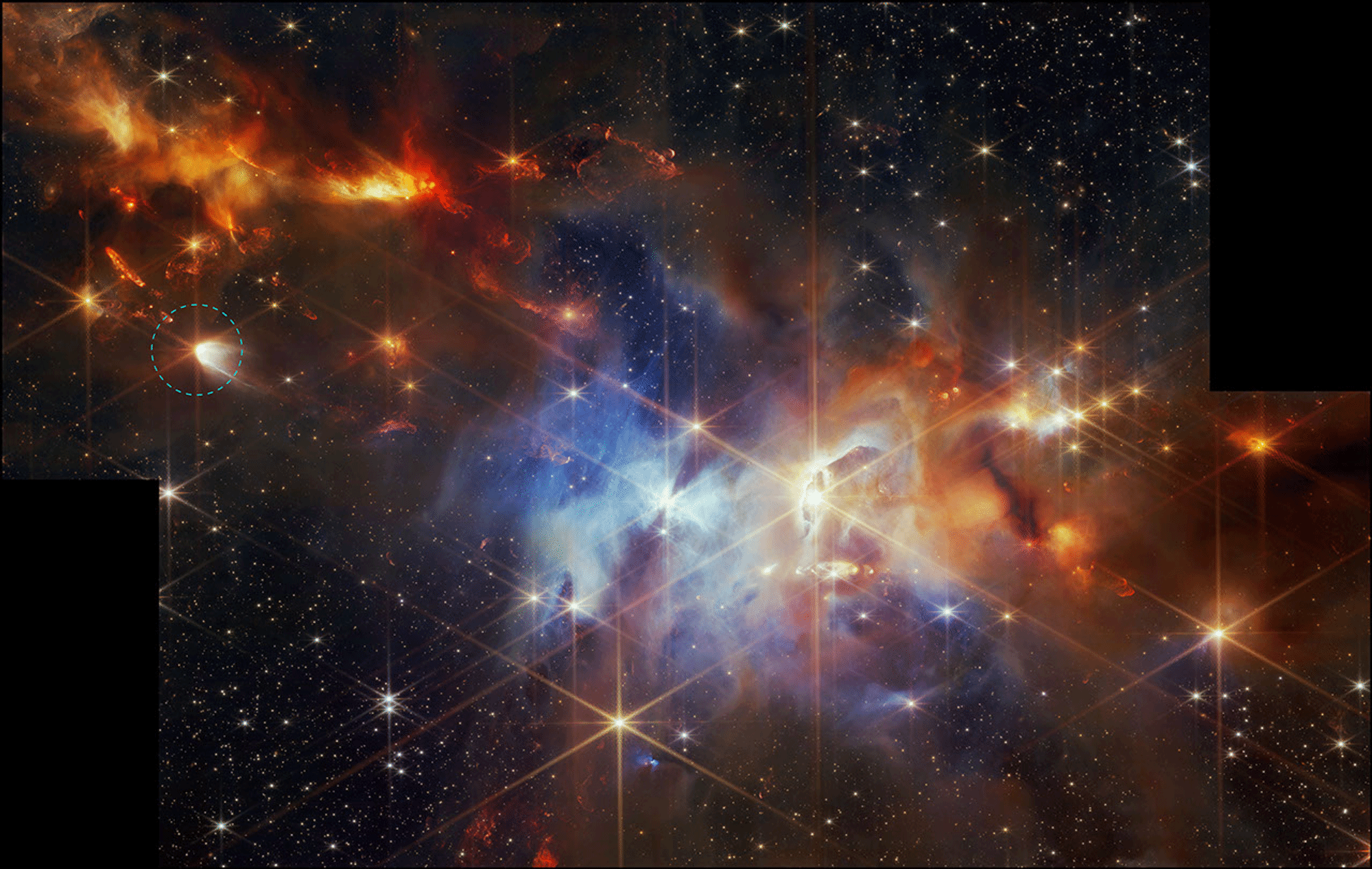 Image 1 caption: NASA’s James Webb Space Telescope’s 2024 NIRCam image shows protostar EC 53 circled. Researchers using new data from Webb’s MIRI proved that crystalline silicates form in the hottest part of the disk of gas and dust surrounding the star — and may be shot to the system’s edges. Image: NASA, ESA, CSA, STScI, Klaus Pontoppidan (NASA-JPL), Joel Green (STScI); Image Processing: Alyssa Pagan (STScI)