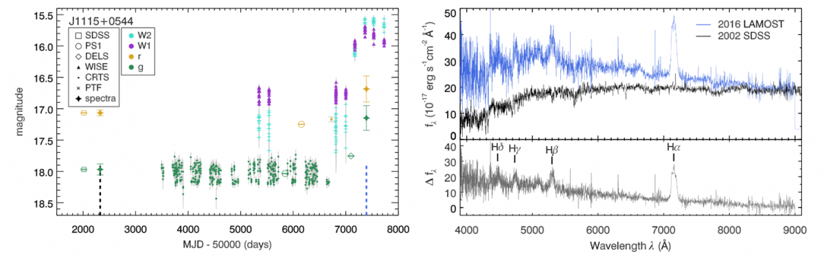Figure 2: Left: The optical and mid-infrared light curves of a newly discovered changing-look quasar J1115+0544. Right: The spectra change over 14 years. The black and blue curves are SDSS and LAMOST spectra respectively. The lower part shows the difference between two spectra (Figure is taken from Yang et al. (2018))