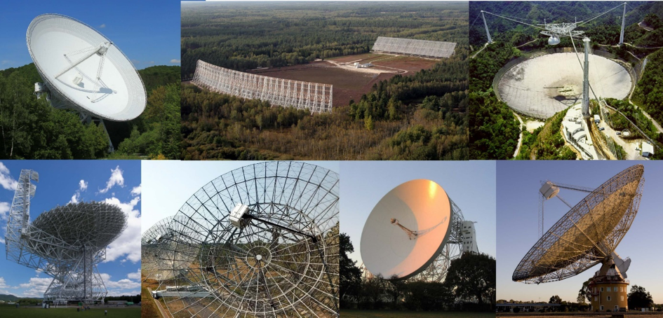 Fig. 2: Telescopes used for the observations within the International Pulsar Timing Array (IPTA). Clockwise from upper left: Effelsberg/Germany, Nancay/France, Arecibo/Puerto Rico, Parkes/Australia, Lovell Telescope/UK, Westerbork, The Netherlands and GBT/United States.
