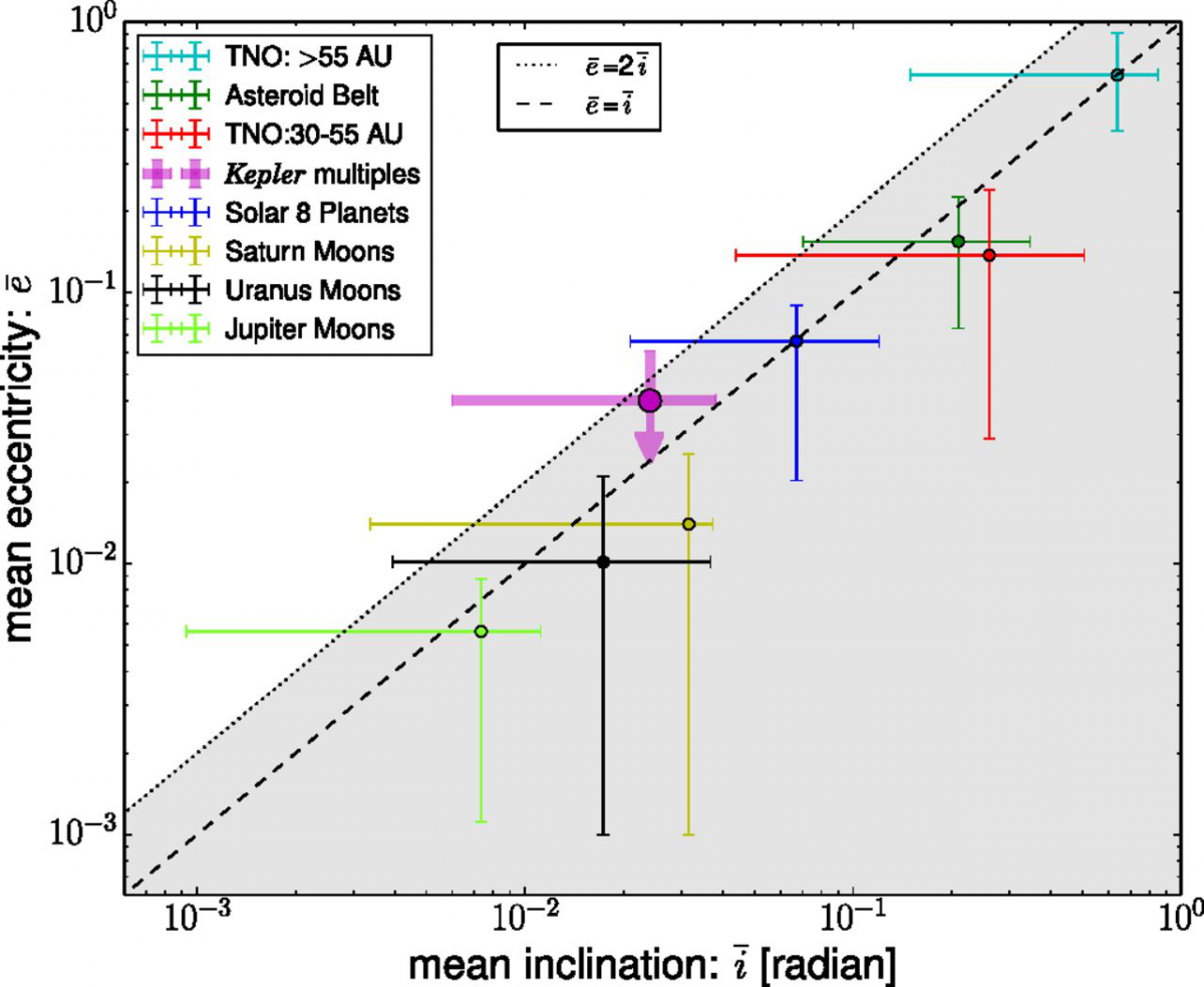 Figure 2 (from the published PNAS paper). The mean eccentricity (e) and inclination (i) of Kepler multiples fit into the pattern of the solar system objects satisfying a relation e ≈ (1-2) x i. The dots represent the Kepler multiple planets (magenta), the 8 planets of the solar system (blue), regular moons of Jupiter, Saturn, and Uranus (light green, yellow, and black); main belt asteroids (green); and trans-Neptune objects (TNOs; both the classical Kuiper Belt objects with orbital semi-major axes 30–55 AU shown in red and the scattered disk objects with semi-major axes >55 AU shown in cyan).