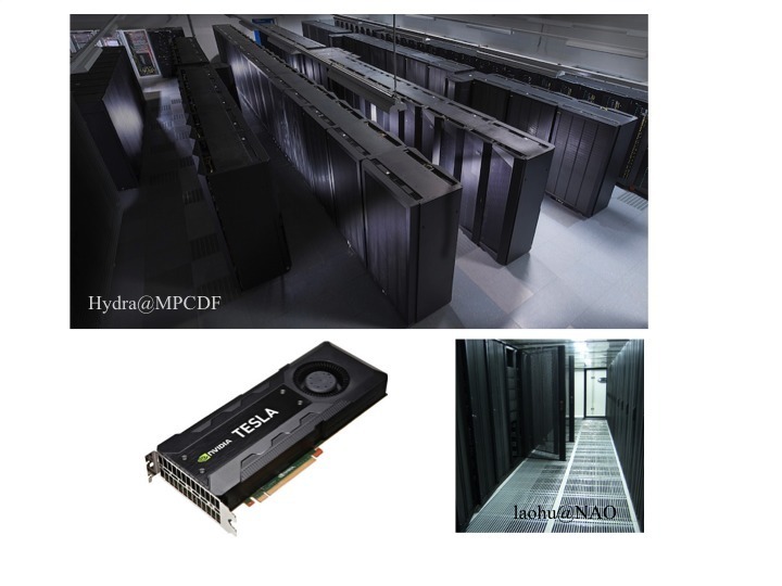 They have been possible after significant improvements of the simulation software on the laohu supercomputer of the Center of Information and Computing at National Astronomical Observatories, Chinese Academy of Sciences. The code has excellent parallel performance using, simultaneously, multi-node parallelization, OpenMP on the nodes and general-purpose Kepler K20 graphic cards acceleration (GPGPUs) to compute the gravitational forces between the stars. A typical DRAGON star cluster simulation used 8 nodes of Hydra with 160 CPU cores and about 32k GPU threads, for a consecutive computing time of the order of one year (8000 wall-clock hours).