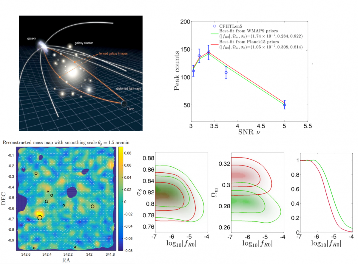 By applying it using CFHTLenS with priors from WMAP and Planck CMB observations, the team has derived tight constraints on the Hu-Sawicki f(R) theory, for the first time, from WL high peak abundance. No deviations from the general relativity theory are detected. The study demonstrates clearly the promising potential of WL peak analyses. With on-going and future large observations with much improved data quantity and quality, we expect WL peak analyses will result in much better cosmological constraints. Low statistical errors in future observations ask for tighter systematic controls in cosmological observables. The team has been continuously working toward fully realizing the power of WL analyses in future cosmological studies.
