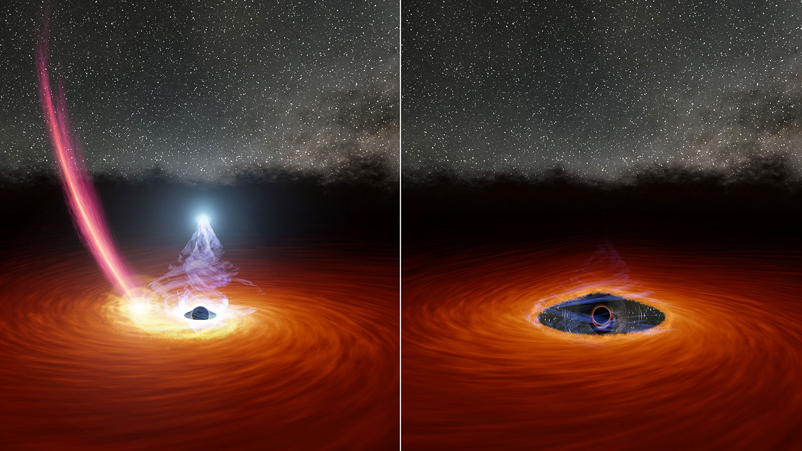 Caption: This illustration shows a black hole surrounded by a disk of gas. In the left panel, a streak of debris falls toward the disk. In the right panel, the debris has dispersed some of the gas, causing the corona (the ball of white light above the black hole) to disappear. Credit: NASA/JPL Caltech