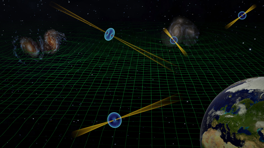 Radiation beams from the pulsars’ magnetic poles circle around their rotational axes, and we observe them as pulses when they pass our line of sight, like the light of a distant lighthouse. Pulsar timing arrays (PTAs) are networks of very stably rotating pulsars, used as galactic-scale GW detectors. In particular, they are sensitive to very low frequency GWs in the billionth-of-a-Hertz regime. This will extend the GW observing window from the high frequencies (hundreds of Hertz) currently observed by the ground-based detectors LIGO/Virgo/KAGRA. While those detectors probe short lasting collisions of stellar-mass black holes and neutron stars, PTAs can probe GWs such as those emitted by systems of slowly in-spiraling supermassive black-hole binaries hosted at the centres of galaxies. The addition of the GWs released from a cosmic population of these binaries forms a GWB.