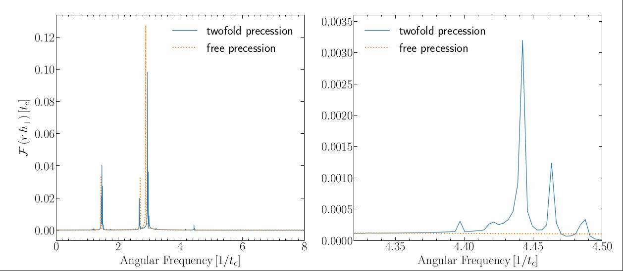 Figure 1. Frequency spectra of the continuous GWs from precessing, rotating neutron stars. The “free-precession” result is predicted by GR while the “twofold-precession” result is predicted by the gravity model that breaks Lorentz symmetry. The right graph is a zoom-in view of the tiny peak in the left graph around 4.4.