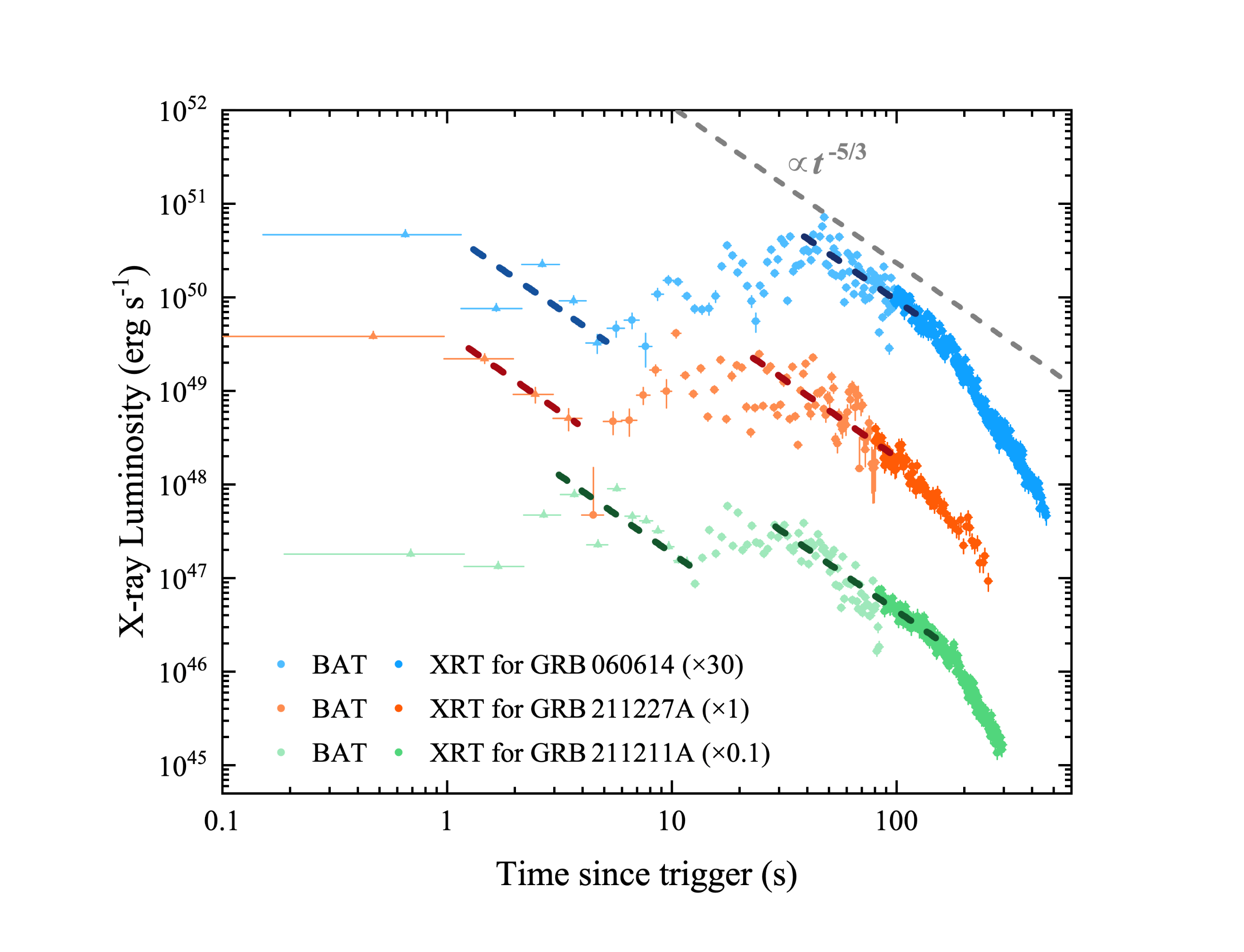 Figure 1: X-ray emissions of three merger-origin long-duration GRBs. Dashed lines represent the processes of fall-back accretion.