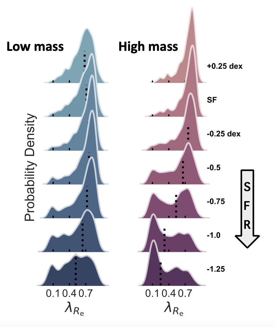 Fig 1: The bimodal λRe distribution varying with star formation rate (SFR), with median values shown by the black dotted lines. Blue and red column are for low-mass and high-mass galaxies respectively (blue: 109.5 < M⋆/M⊙ < 1010.2; red: 1010.8 < M⋆/M⊙ < 1011.3). As denoted on the right, SFR of galaxies decreases from top to bottom at a pace of 0.25 dex difference. The second row shows galaxies on the so-called star formation main sequence, a sequence where most of young galaxies are.