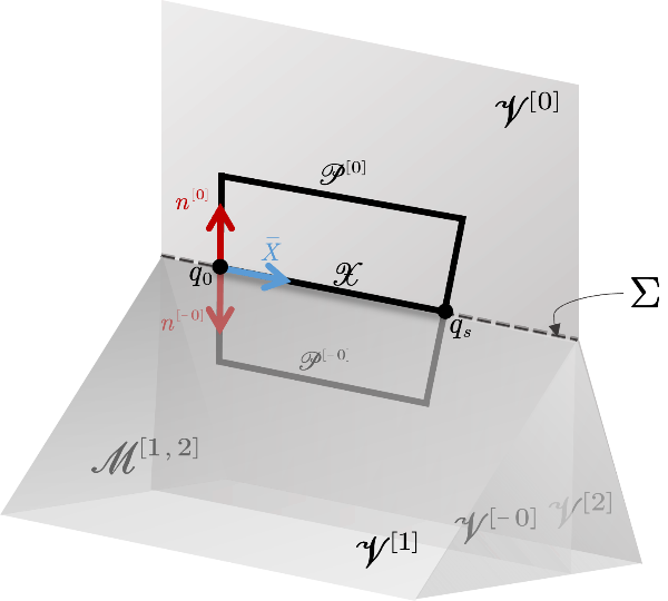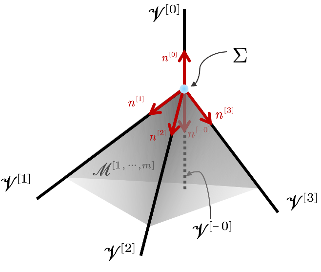 Visualized in Figure 1 for the case of three pages, the booklet is embedded into an external manifold of sufficient dimensionality, enabling the recovery of a differentiable structure. Through meticulous analysis, it was uniquely determined that the dimension of the external manifold is equal to the dimension of the interface plus the number of bulks, minus one. At this juncture, a linear combination of normal vectors to the interface in all pages exists, although this combination may degenerate at certain singular points. These singularities, however, can be disregarded as the junction conditions are local and can be determined within an open set. By arbitrarily selecting one page — referred to as the "gauge" —and extending it in the reverse direction of its normal vector, an auxiliary bulk is constructed. The geometry of the external manifold is then determined by all the pages except the gauge. Through constraints and reductions, the auxiliary bulk's geometry is fully determined. Finally, by applying the classical Darmois-Israel junction conditions between the gauge and its reverse extension, the definition of the Einstein tensor applicable to the entire booklet is circumvented, but the multiway junction conditions across all pages are obtained, a process illustrated in Figures 2 and 3.
